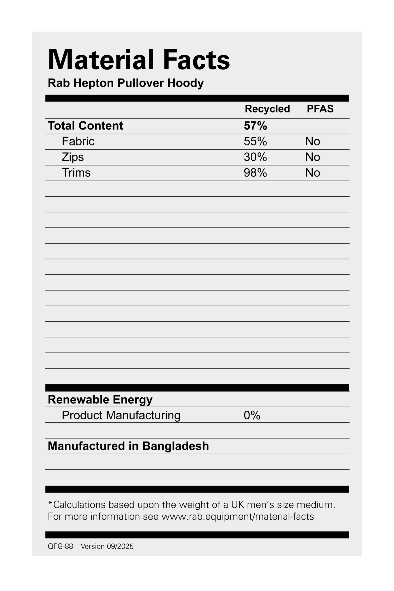 - Fluorocarbon (PFAS) free fabric