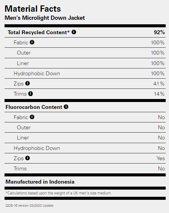 • Insulation: Recycled 700 fill-power down Nikwax hydrophobic (water-resistant) finish (134g Size L)