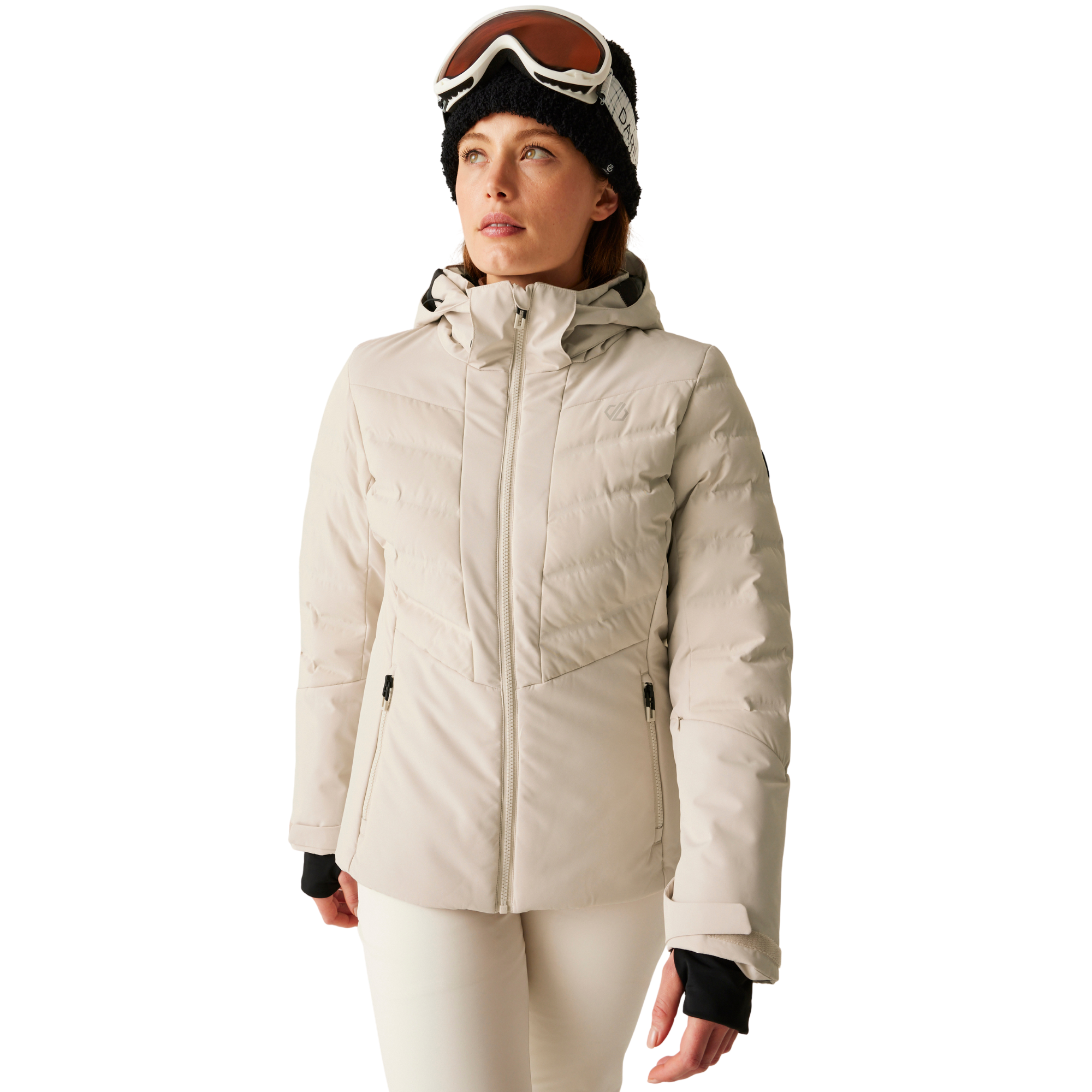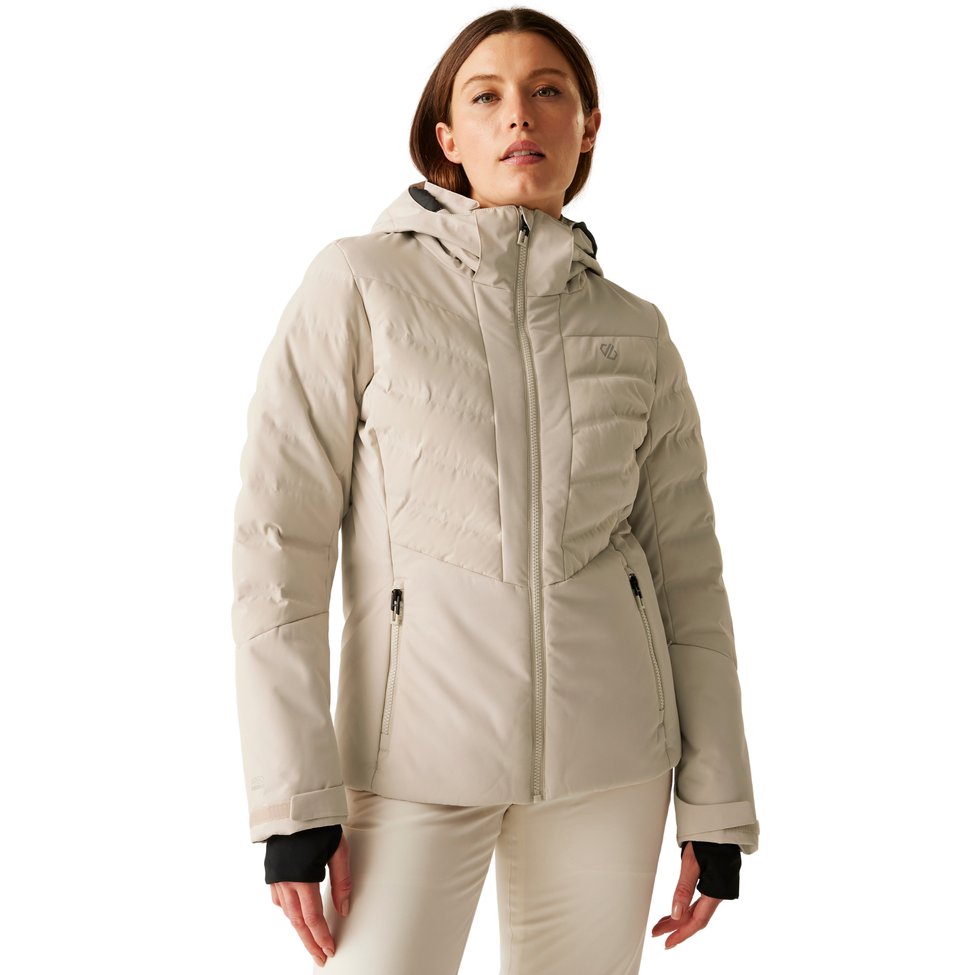 Protective and durable, Dare 2B's Gliding women's ski jacket is built for alpine performance. Made with ARED 10/10 waterproof fabric and articulated sleeves, it offers freedom of movement and warmth. It's packed with ski-ready features, and is finished with a wired peak hood, secure pockets and heat-sealed design elements.