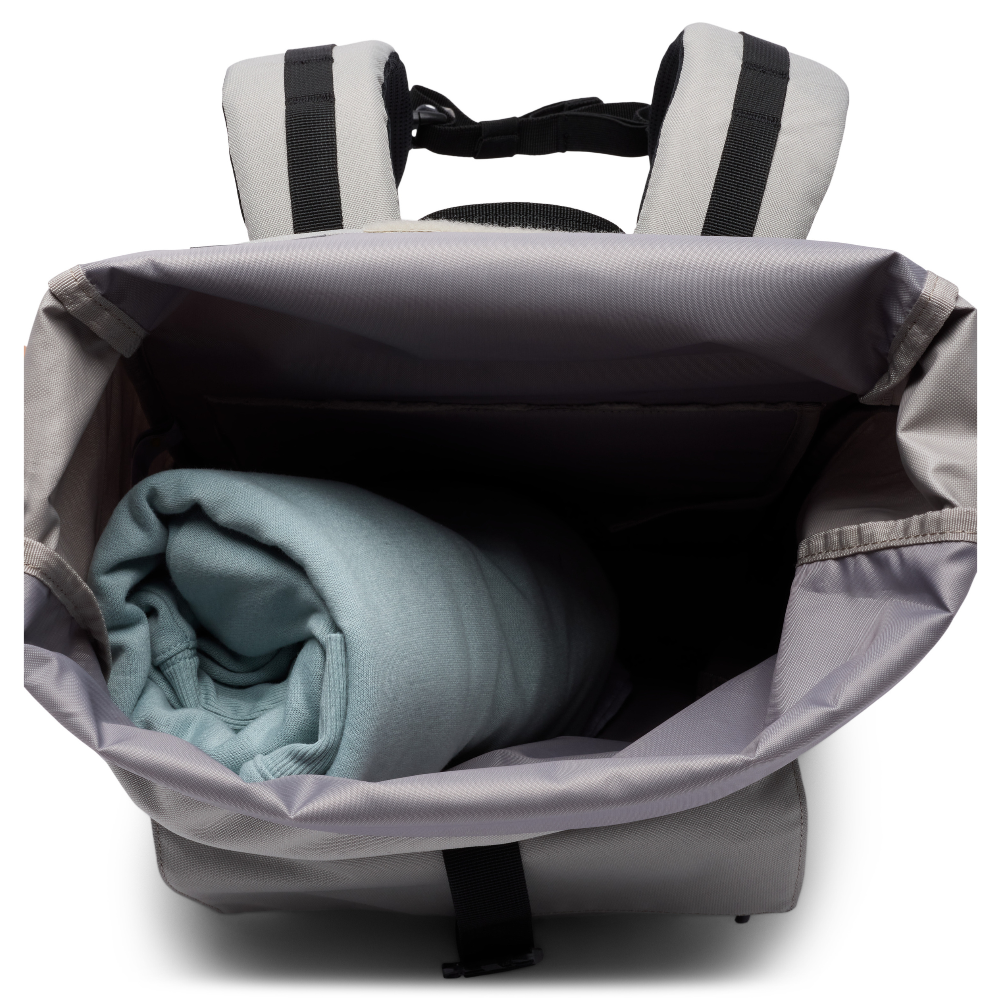 - Roll top closure for adjustable capacity and added security